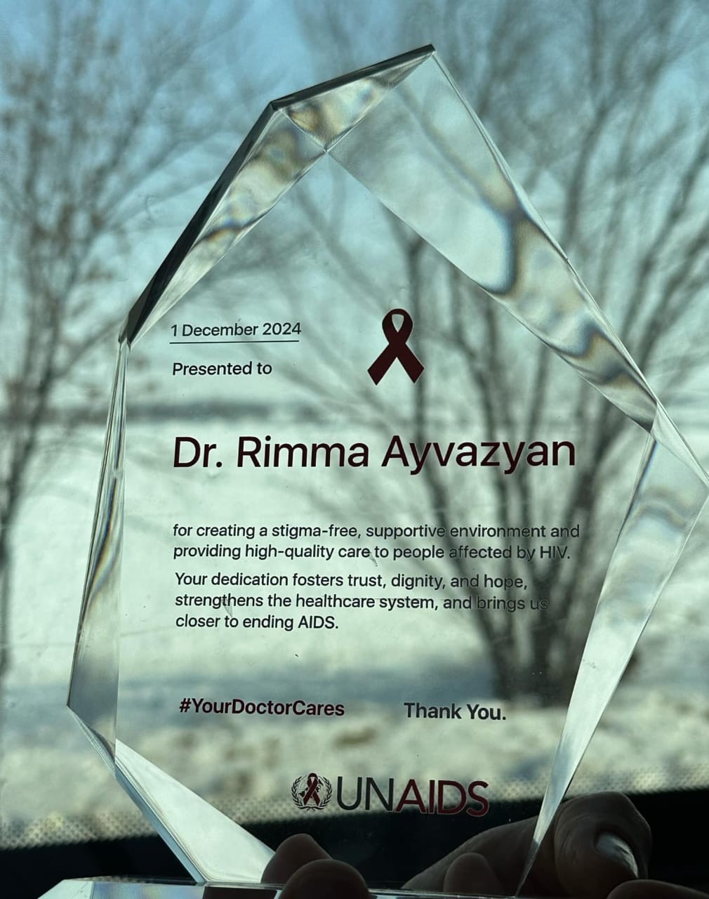 ՄԱԿ-ի ՄԻԱՎ/ՁԻԱՀ միացյալ հարցերի ծրագրի հայաստանյան գրասենյակի ղեկավար Ռոզա Բաբայանը մեր մասնագետին է հանձնել ՄԱԿ-ի շնորհակալագիրը՝ ընդգծելով, որ բժշկի այդչափ նվիրումը ավելի է մոտեցնում ՄԻԱՎ/ՁԻԱՀ-ի դեմ պայքարի վերջնակետին։